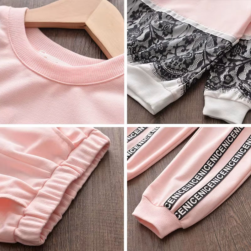 KOMPLET DZIEWCZĘCY RÓŻ BLUZA SPODNIE KORONKA